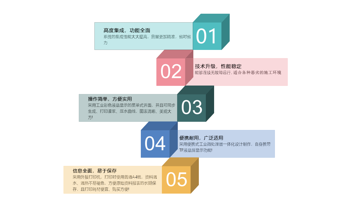 系统可自动统计各种掺加剂的使用量,可自动统计管路占浆;当系统断电、来电、暂停、开始、结束时有中文提示, 支持压力、流量超限提示;提供中文、英文、中英文对照三种版本界面显示和报表打印,适应国内和国外工程需要; 灌浆数据实时高速采集存储,突然断电后不丢失,来电可继续记录;能够连续无故障运行,特别适合各种恶劣的施工环境。