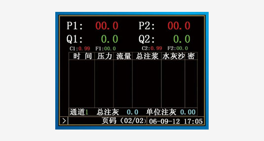 采用工业彩色液晶显示的菜单式界面,高度仿真,用不同颜色实时显示2个通道的压力、流量、密度和抬动数据, 通过报表形式显示时间、平均压力、平均流量、平均密度、累计注灰、透水率、抬动值等数据。 在实时显示灌浆压水过程中数据的同时,可进行资料整理,自动生成灌浆规范中的报表和数据成果分析图表。 采用多功能键盘输入各种参数,参数输入菜单具有提示功能和输入格式检查功能,输入错误时系统自动提示。